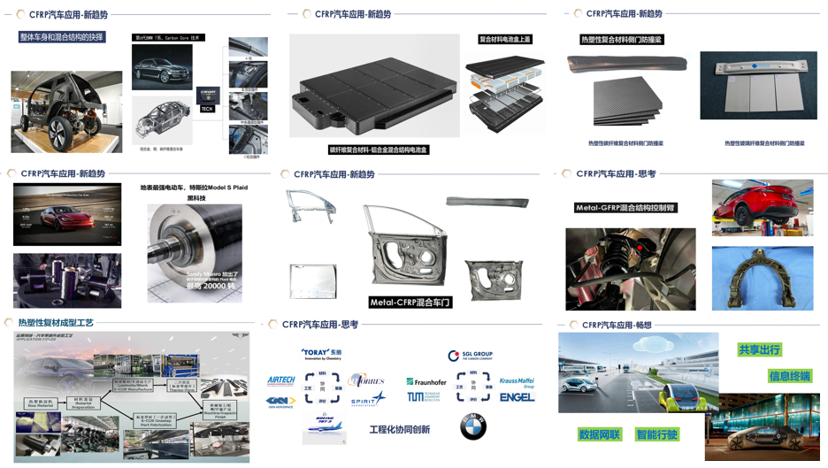 该报告分享了碳纤维复合材料性能优势,在汽车行业的应用历史和现状,以及未来的发展趋势等几方面内容。报告认为在汽车电动化、智能化、网联化与共享化的历史背景下,汽车作为信息移动终端载体,车身轻量化材料的应用势不可挡,轻量化有色金属材料与高性能纤维复合材料形成混合车身结构,是车身结构演变的重要方向,不同材料发挥各自的性能优势,将进一步提升整车的轻量化水平。