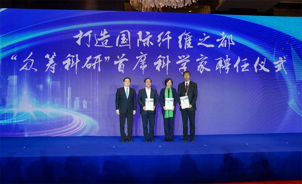 庄木弟为国际纤维之都“众筹科研”的首席科学家颁发聘书,程鹏与刘健共同为国际纤维之都“全球招商合作伙伴”代表授牌。