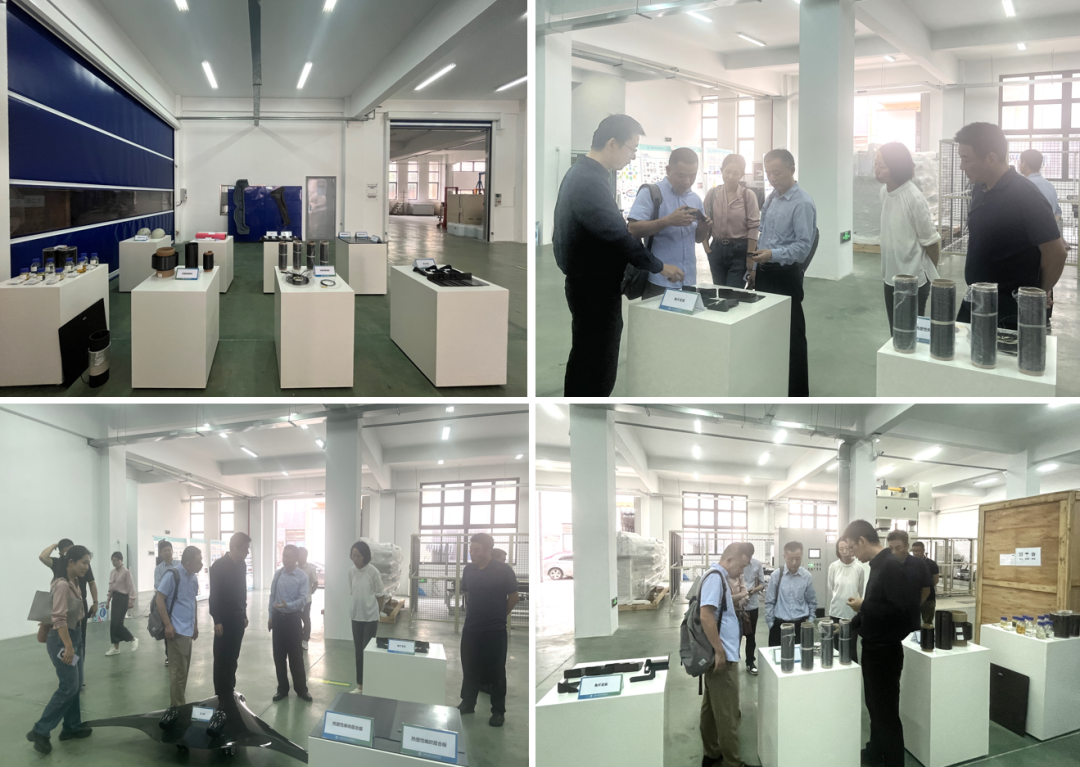 在现场,方浩处长一行了解了研究院及孵化合作企业在热塑性预浸丝、热塑性中间体板材、热塑3D打印丝、耐高温与可回收树脂、特种复材成型辅料、应急救援装备、航空与汽车零部件等相关产品的研发成果。