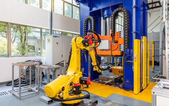 应用背景:自动化模压成型系统将模压成型周期短、生产节拍高的特点和自动化快速转移的优势相结合,能够实现纤维增强热塑性预浸料(预浸带/卷材)、湿法模压(WCM)、预浸料模压(PCM)、高压RTM(HP-RTM)等小型零部件的批量稳定生产。该成型系统主要特点是配备一套先进的高温加热控制系统(最高工作温度450℃),通过机器人转移和自动化上下料工装的系统集成,实现热固性复合材料以及PC、PA、PPS、PEEK等热塑性复合材料零件的连续自动化高效生产,在航空角片、轨道交通和汽车零部件等结构成型方面具有极大的应用前景。