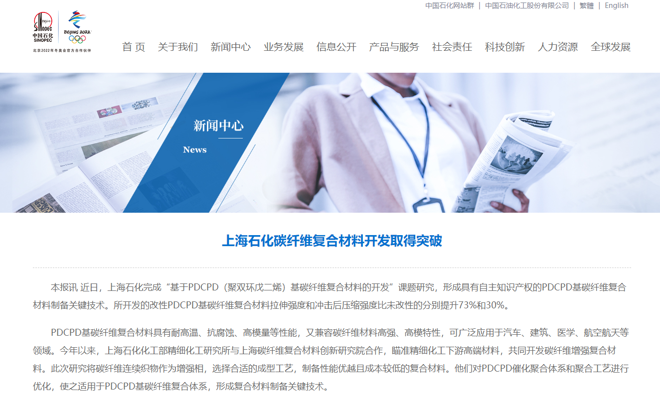 PDCPD基碳纤维复合材料具有耐高温、抗腐蚀、高模量等性能,又兼容碳纤维材料高强、高模特性,可广泛应用于汽车、建筑、医学、航空航天等领域。今年以来,上海石化化工部精细化工研究所与上海碳纤维复合材料创新研究院合作,瞄准精细化工下游高端材料,共同开发碳纤维增强复合材料。此次研究将碳纤维连续织物作为增强相,选择合适的成型工艺,制备性能优越且成本较低的复合材料。他们对PDCPD催化聚合体系和聚合工艺进行优化,使之适用于PDCPD基碳纤维复合体系,形成复合材料制备关键技术。