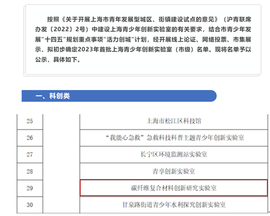 近日,研究院碳纤维复合材料创新实验室经过线上答辩论证、网络投票等入围2023年首批上海市级青少年创新实验室。